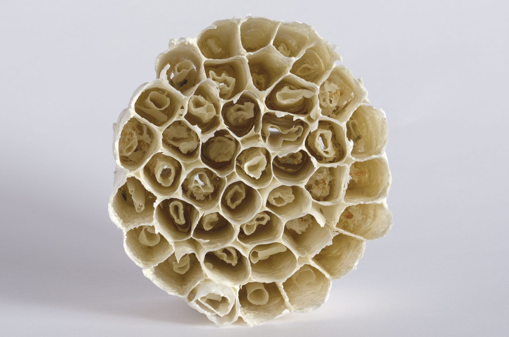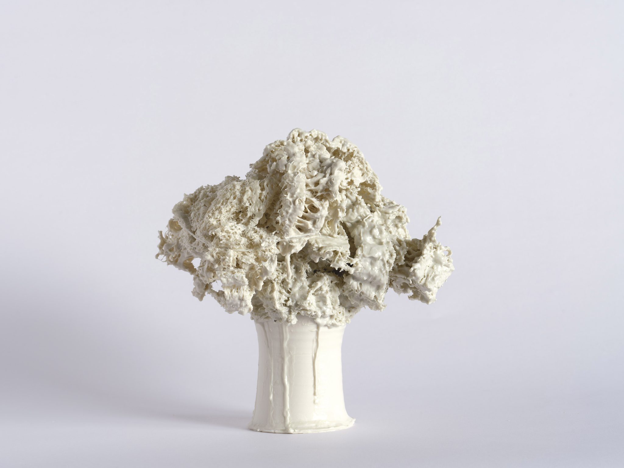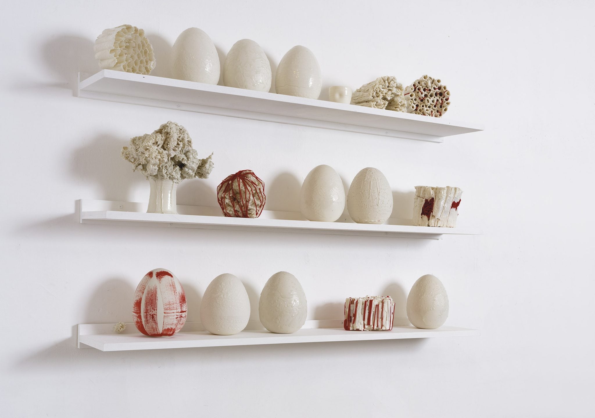 בשלב הזה, היא אומרת, נוצר המפגש בין שני תהליכים מקבילים: הליפה כגוף שנשרף ונעלם אל תוך הפורצלן, והקרושה כפעולה ידנית איטית שמחזירה מגע, שליטה וחיבור. הסריגה נבנתה סביב גופי הפורצלן – הליפות, לא על פי תבנית מוקדמת אלא מתוך הקשבה לכל אובייקט שכל אחד מהם דרש חבישה אחרת, קצב אחר, צפיפות אחרת.