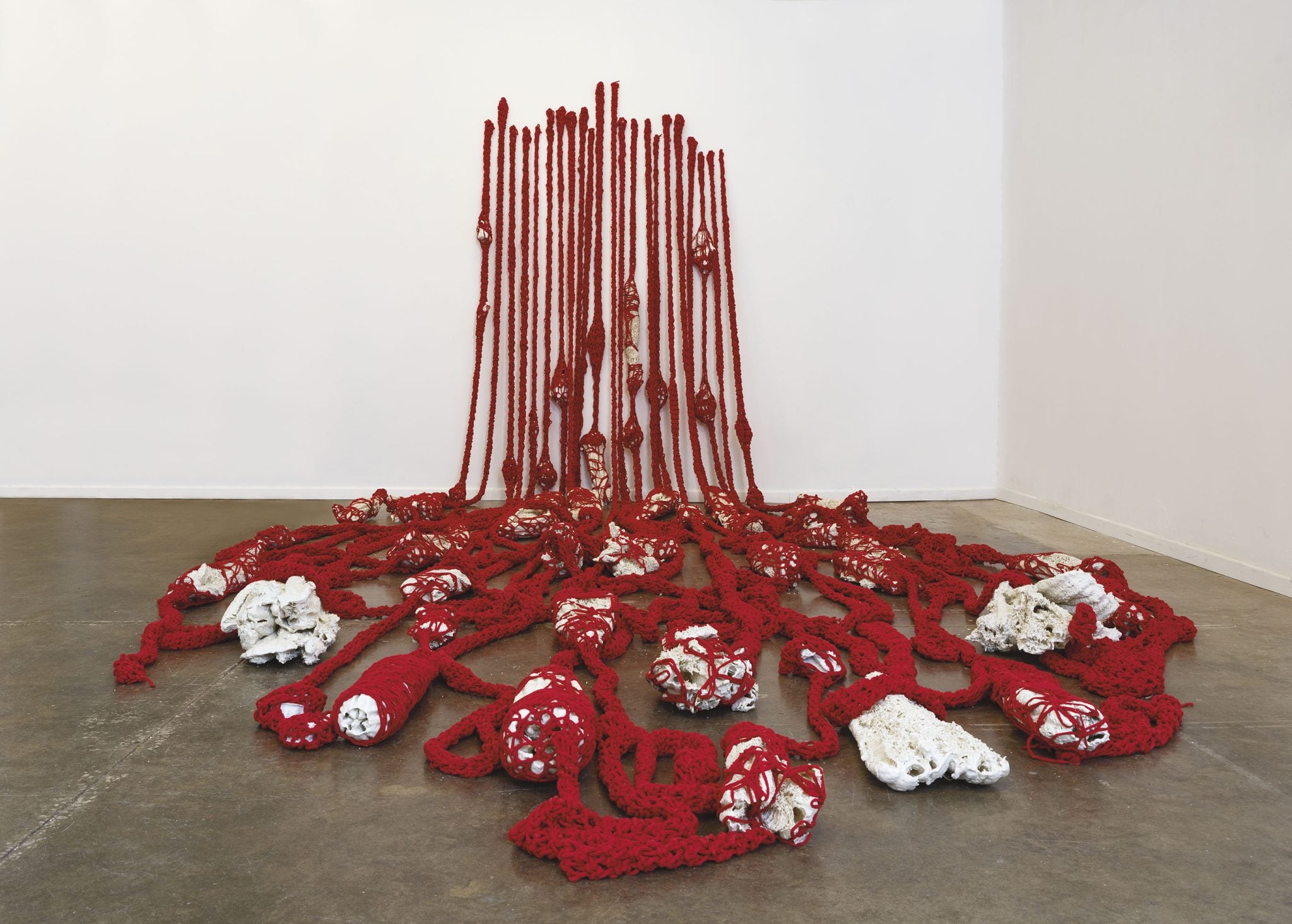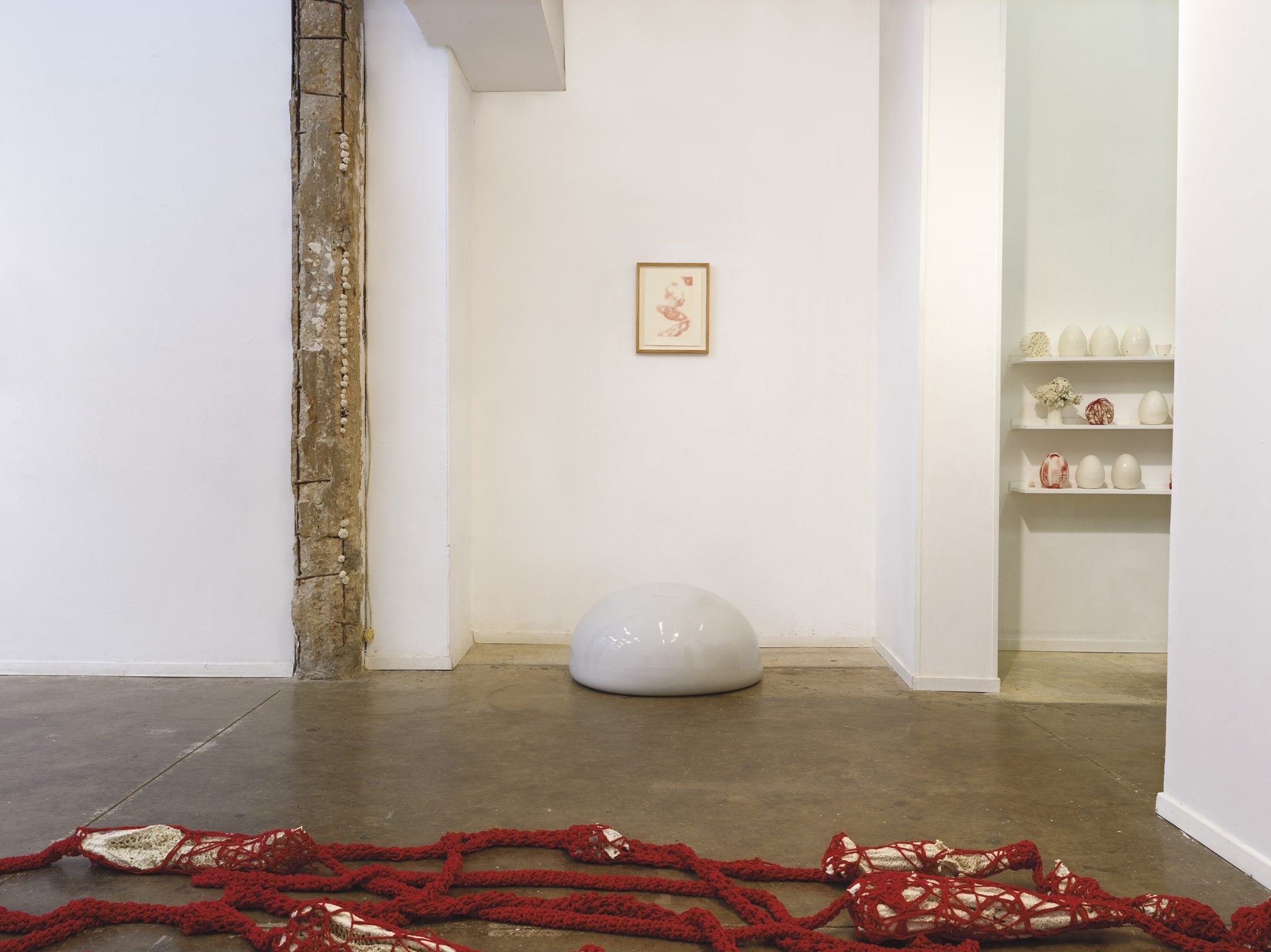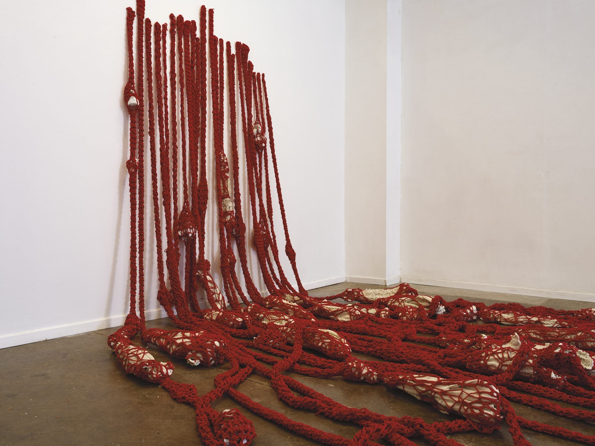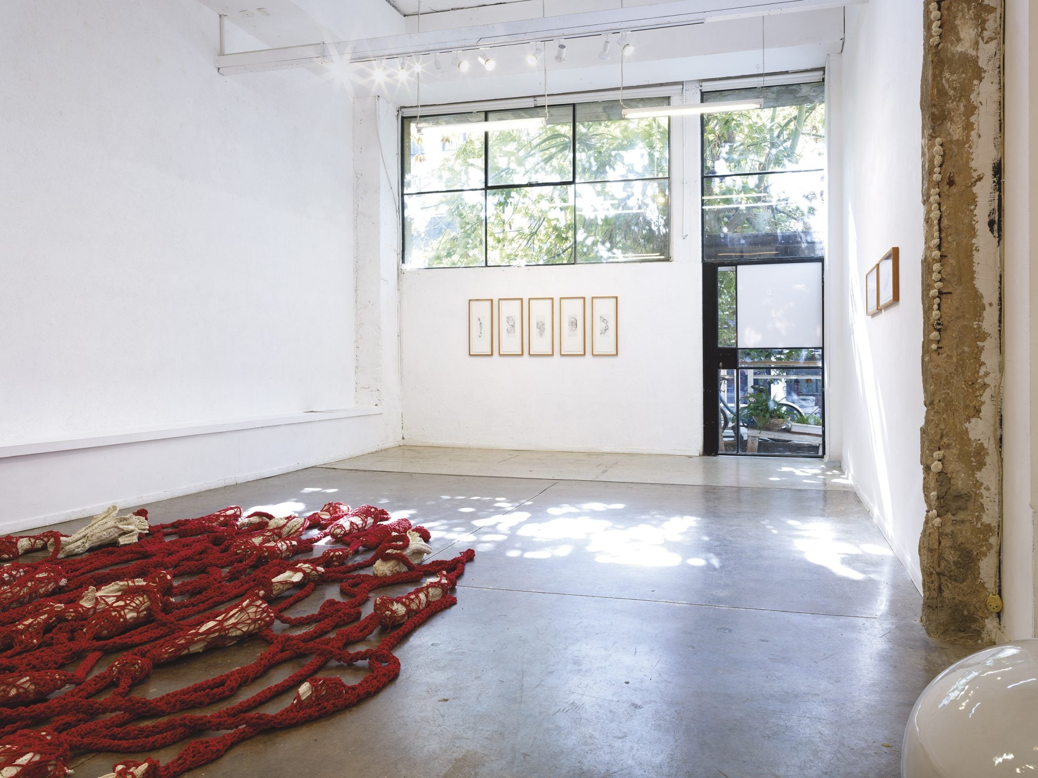 המיצב המרכזי בתערוכה מתפקד כגוף חי. חוטים אדומים משתלשלים מקיר שגובהו כשני מטרים, נקשרים זה בזה, מסתבכים ונספגים אל תוך הרצפה שצבעה אפור בטון. הצבע האדום מזכיר דם, פצע, גוף וגם סוג של פעולה כירורגית; ומעלה קשר ישיר בין חומר, גוף וזמן. החוטים כורכים את האוביקטים העטופים – גופי הליפה המפוסלים, שמזכירים איברים או פצעים. אלו מתפקדים כמעין צלקות פועמות; אלמנטים קשורים זה בזה ומחוברים אל ליבה אחת.
