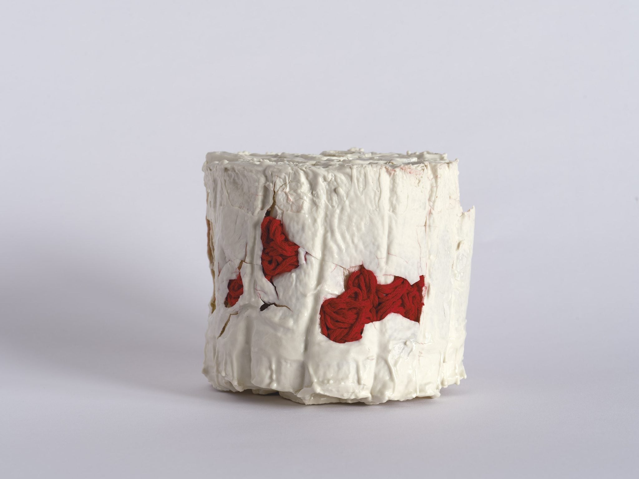 ״החוטים לא הסתירו את הפציעה אלא הדגישו אותה, מחזיקים את הצורה במתח שבין פגיעוּת לאחיזה. כך נוצרה שפה חדשה ומאחדת: קרמיקה שמגלמת אובדן, שריפה והיעלמות, והסריגה האדומה שפועלת כתיקון זמני. החיבור ביניהן הוא לא רעיוני בלבד, אלא גופני ומעשי״.