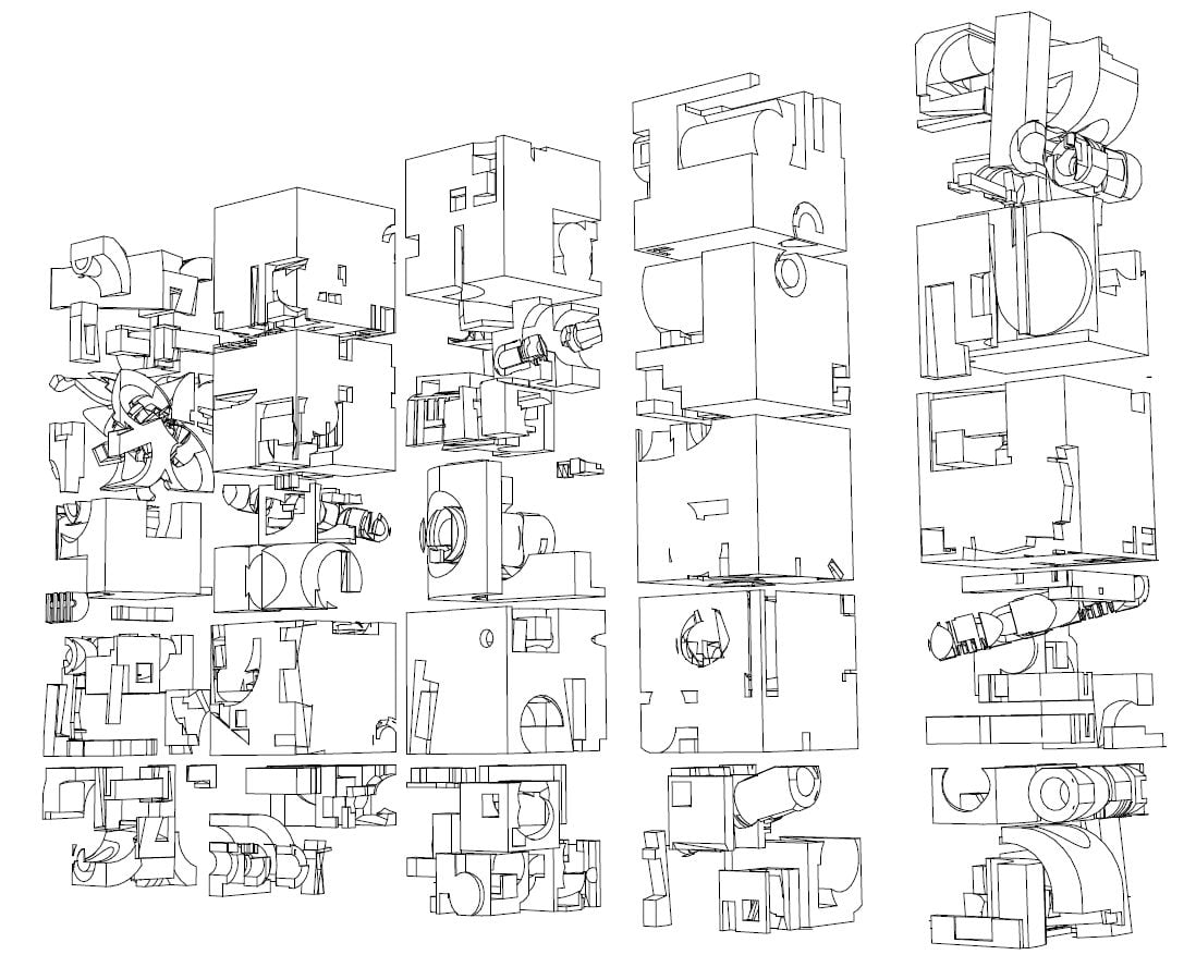 למדתי רבות על חומרי ההדפסה השונים, המייצרים כל אחד מופע שונה במרחב. החלטתי להדפיס מהחומר השקוף ביותר הנמצא על המדף, ובכך לחשוף גם את הקונסטרוקציה הפנימית של כל גוף וגוף, וגם את יחסי הגופים בינם לבין עצמם ובינם לסדר המבנה הכללי