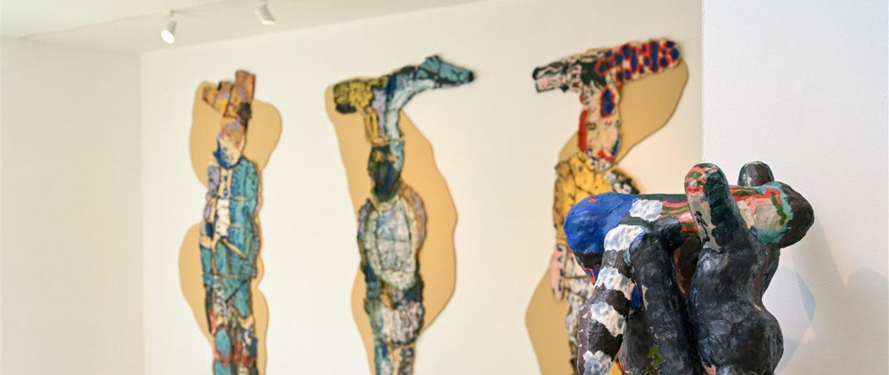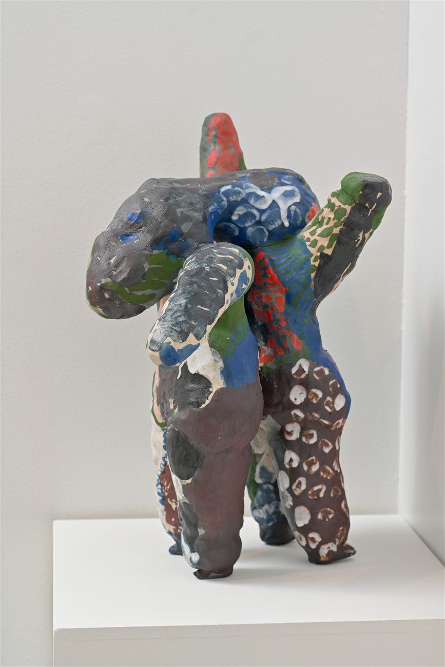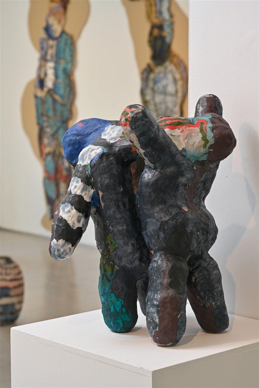 גור: כן. אני מציג שישה פסלים של דמויות, בגודל 50-60 ס״מ, בנויות בבניית יד. הבנייה שלהן וגם הצבעוניות שלהן התהוותו מתוך אינטואיציה. הן גושניות, חומריות, טקסטורליות. ניסיתי ליישם עליהן צבעוניות שמתייחסת לתכונות החומריות והנפחיות שלהן ועובדת איתה, ולא נראית כמו קעקוע על גבי אבן