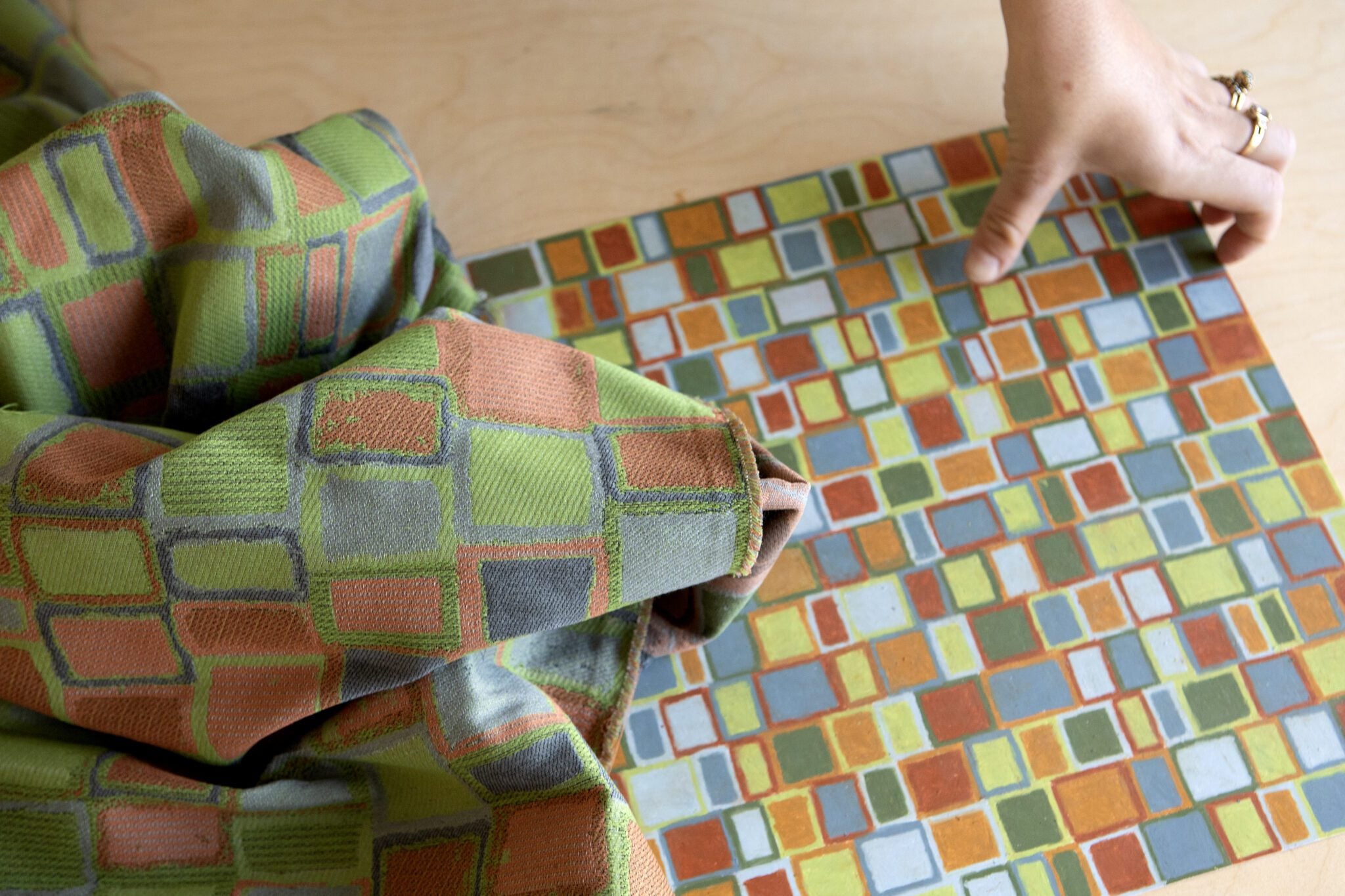 צביה: הוא נקרא ״סטודיו תמטי״ והוא פתוח לשימוש באיזו טכניקה שנרצה. לומדים בו איך לממש פרויקט גדול – החל מצורת מחשבה על רעיונות, פיתוח שפה וסטוריטלינג, ועד למימוש החלום. במקרה שלי יצרתי מיני־תערוכה בתוך הכיתה, שילבתי ציורים וצילומים שלי ובמרכז היה השטיח הארוג מקולאז׳ של ציורים.