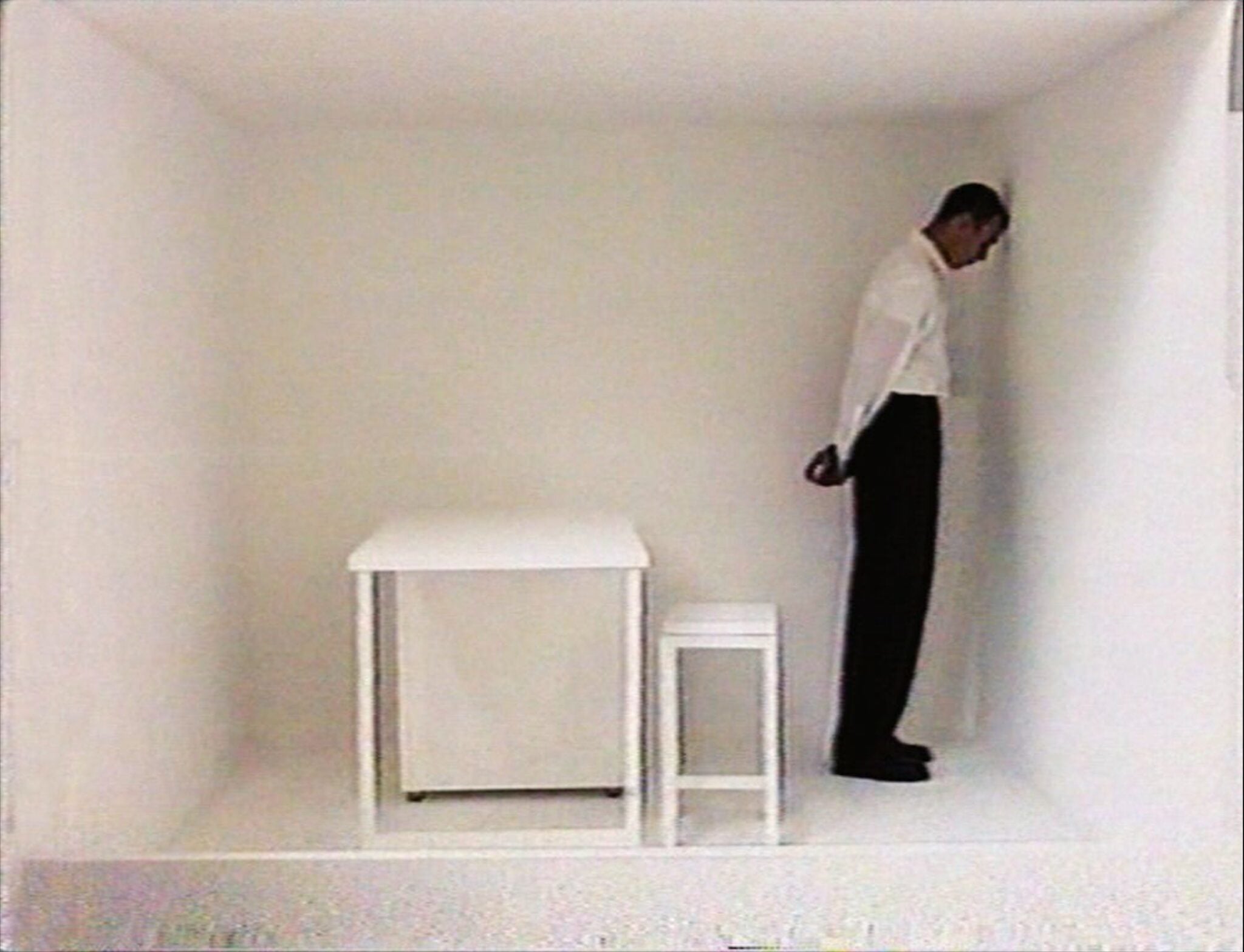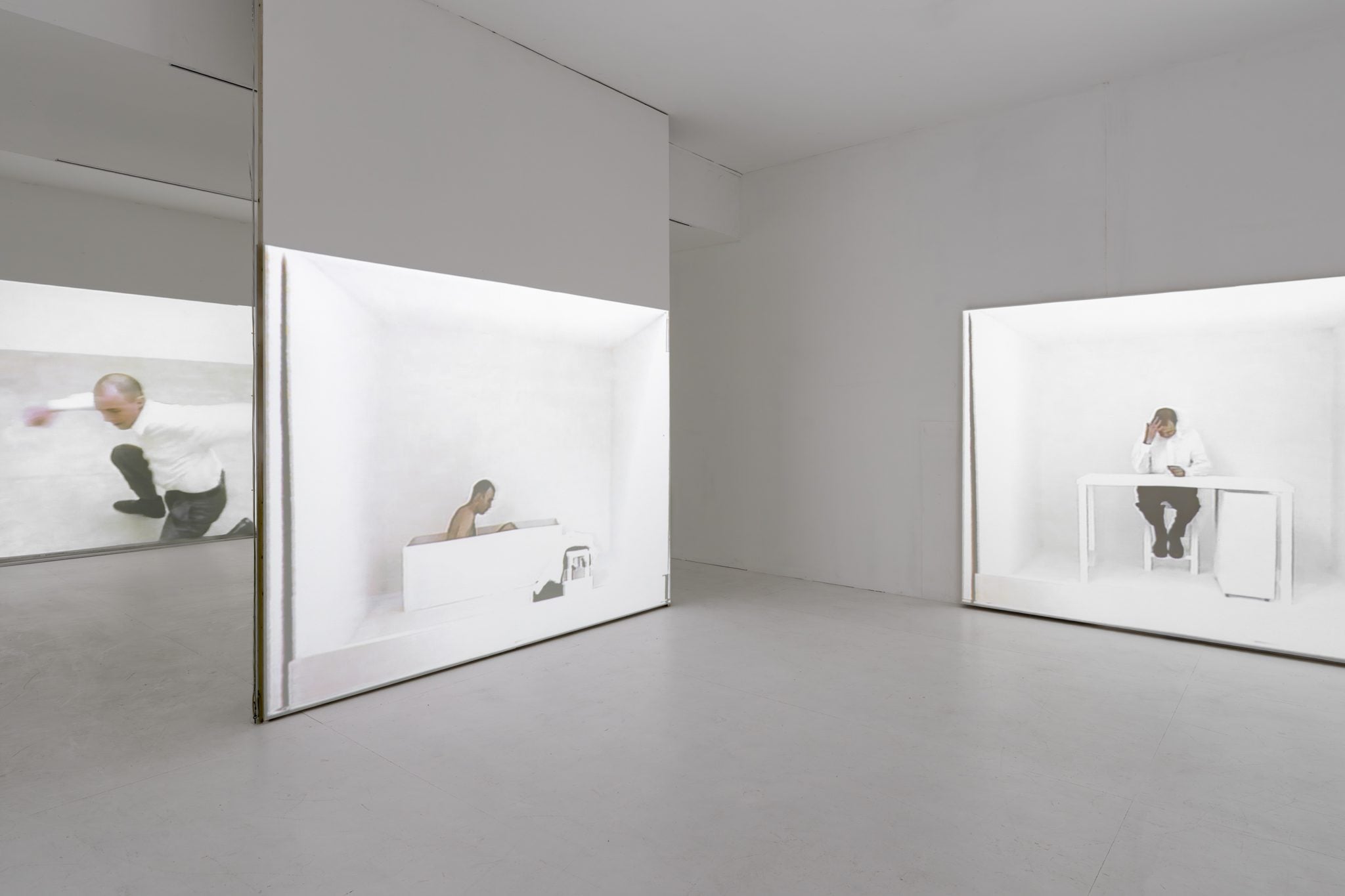 מתוך כשבע עבודות וידאו שהספיק אבשלום ליצור, מוצגות בתערוכה ארבע. ״הדגש היה להציג את אבשלום בגופו, וגם להקרין את העבודות בקנה מידה שהוא כמעט אנושי. אמנם לא אחד לאחד, בעיקר כדי לא להפוך את העבודות הללו למונומנטליות, אבל כצופה את מרגישה את הפעולות של אבשלום בעבודות ביחס לגוף שלך, בגובה העיניים. באופן מוזר, החלל של ה־CCA נראה קצת כמו תא של אבשלום, בגלל שגם הרצפה שלו לבנה, כך שגוף העבודות הפיסולי שלו ממילא מהדהד״.