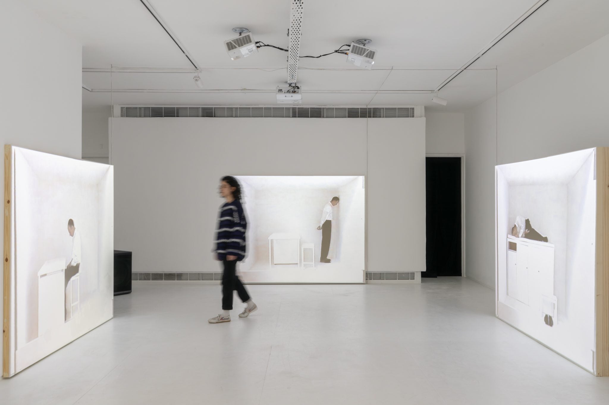 אחד הכללים שהיו לאבשלום עבור התאים שבהם התכוון לגור, היה לאפשר לאדם אחד לבקר אותו בכל פעם, במרחק מדוד של 45 ס״מ. גם בהצבה של מסכי ההקרנה ניסתה כהן־שניידרמן, בעזרת המעצב והאדריכל ערן איזנהמר, לבטא את אותה צפיפות ודחיסות, אינטימיות מוגברת. המסכים הוצבו על משטחים מעץ ולא מגבס, כמו אלה שמהם היו בנויים תאיו של אבשלום, והסאונד בוקע מהם ישירות. ״הפכנו את משטחי ההקרנה לרמקולים, ודרכם שומעים את הפעולות השונות.