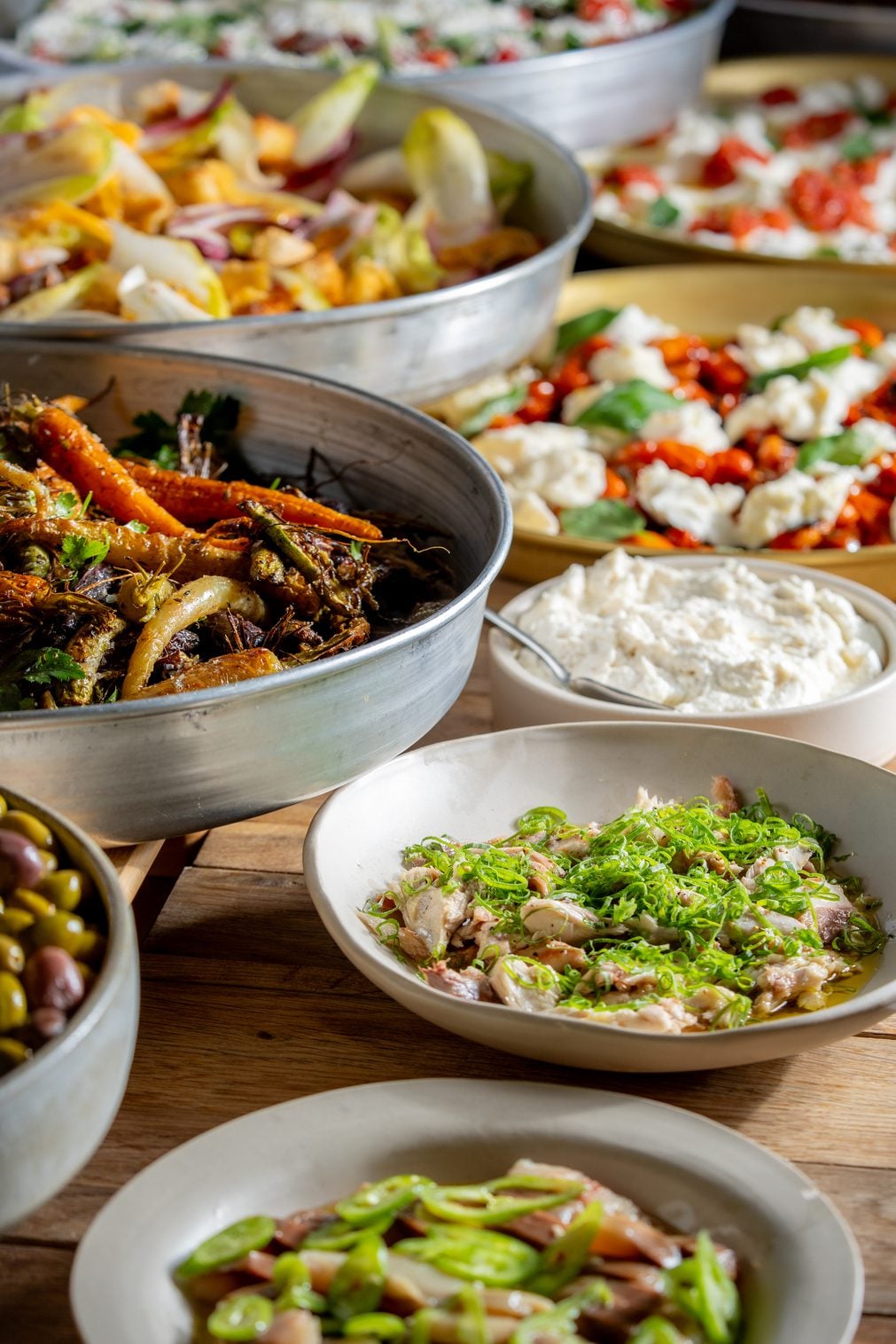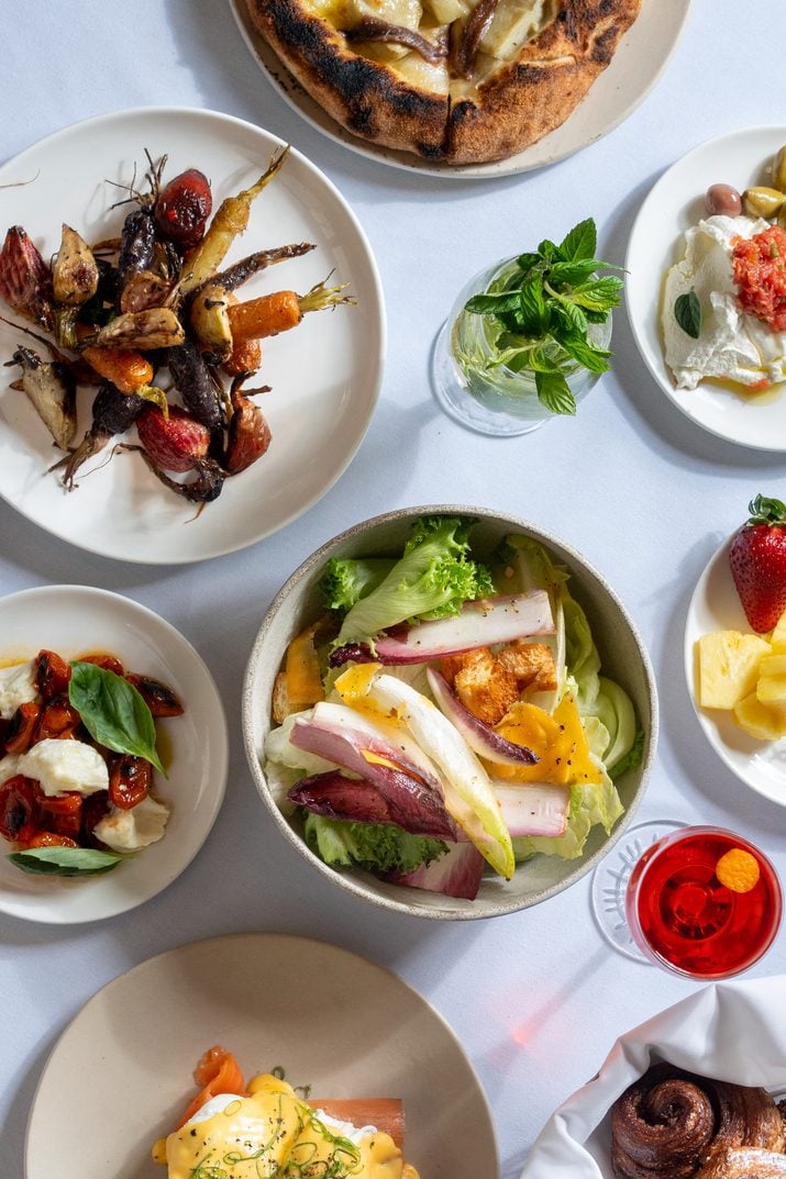זה מתחיל בבופה עשיר בדגש על ירקות – מסלטים טריים בשלל שילובים (למשל סלט חי של תרד טורקי, פומלה ושומר צעיר) ועד מגוון ירקות צלויים (בהם ארטישוק בריגול עם פרמזן מיושן 18 שנים, או גזרים וסלקים צבעוניים צלויים בטאבון). בפינת הפחמימות המנחמות: לחמי המחמצת המעולים של ״חגי והלחם״ ושלל מאפים מלוחים ומתוקים, מפיצות לוהטות מהטאבון בתוספות שונות ועד קרואסונים ועוגות הום מייד. בנוסף יש דגים כבושים, גבינות משובחות, פינת מוזלי, פירות טריים וקינוחים.