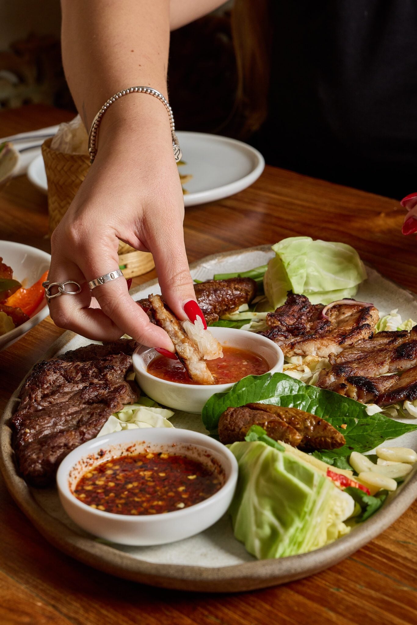 בין המנות בתפריט החגיגות: סום טאם פלה פו קאי קם – גרסה בועטת ומיוחדת לסלט הפפאיה הקלאסי; נאם טוק – נתחי סלמון צרובים על הפלנצ’ה מעל סלט רענן ועוקצני של כוסברה, נענע, צ׳ילי ירוק ומעושן, אורז קלוי וכתוש ורוטב דגים; קונג יאנג – הביסים הצלויים הכי טעימים של בית תאילנדי בצלחת אחת: ברוסט לבן צלוי, נתח בקר עסיסי צלוי, נקניקיית בקר מ״צ׳יאנג מאי״ מתובלת בקארי אדום, שורשים ועשבים תאיים, ונקניקיית בשר לבן מ״איסן״ כבושה קלות באורז דביק, שום ופלפל שחור (מגיעה לצד אורז דביק הרבה ירק ורטבים חריפים).