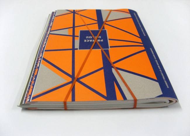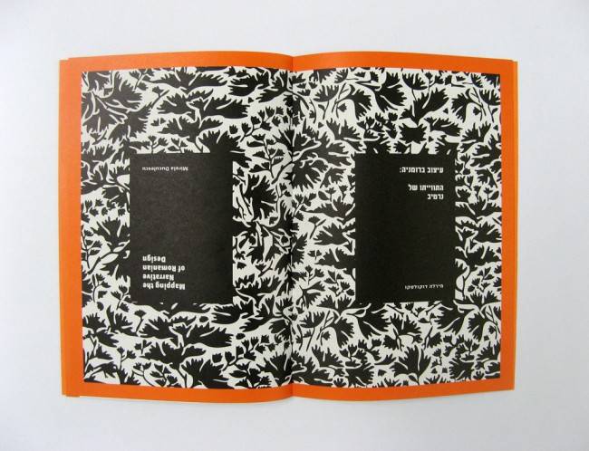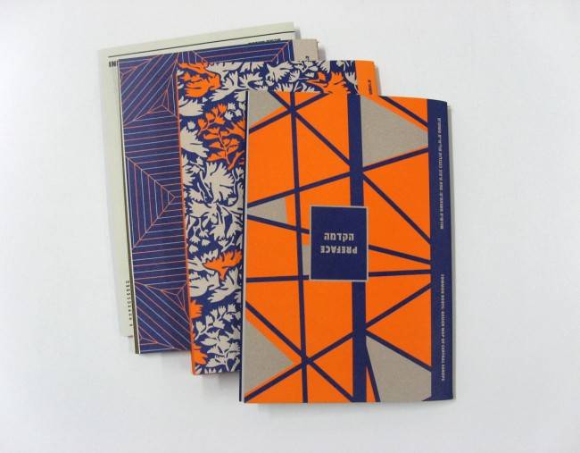 guy saggee: עברנו הרבה גילגולים איתם. התחלנו בתפיסה הרווחת על צבעונית מזרח אירופאית וגילינו כמובן שהיא אינה מצליחה להכיל את העכשיו. זרקנו לתוכה צבעים חיים ומלאים כמו הכתום ושמרנו את הצבעוניות הסגרירית באפור (זה נראה כמו כסף? מעניין…) ובדף של כל החוברת שהוא אפור בעצמו. הצבעים האלו היו צריכים להיות מספיג עמוקים מכיוון שכל אחד מהשלושה פועל על הכריכה כצבע משלים לשחור בכל אחת משלוש החוברות.