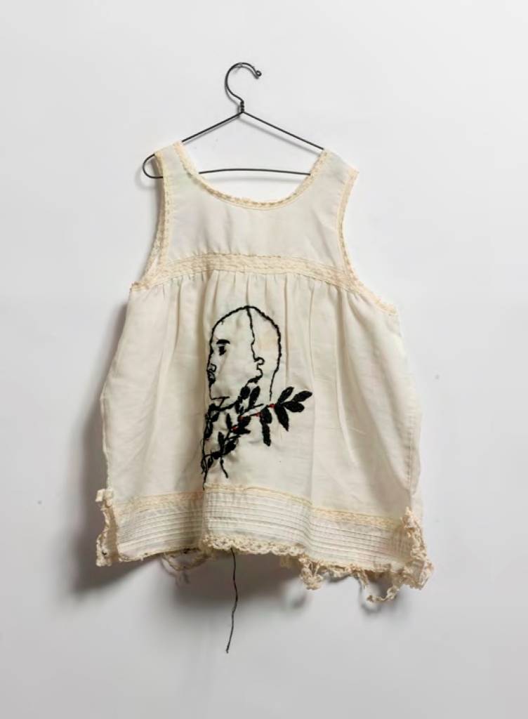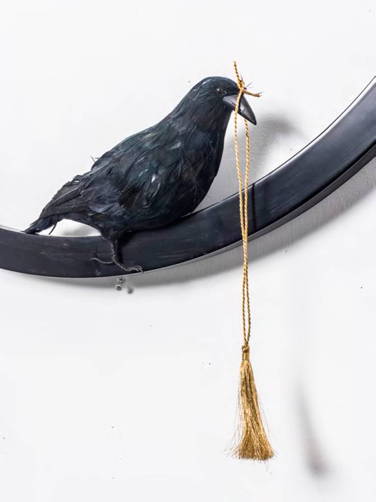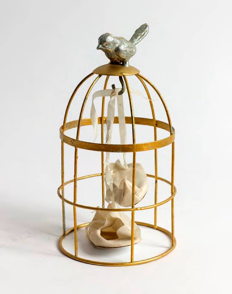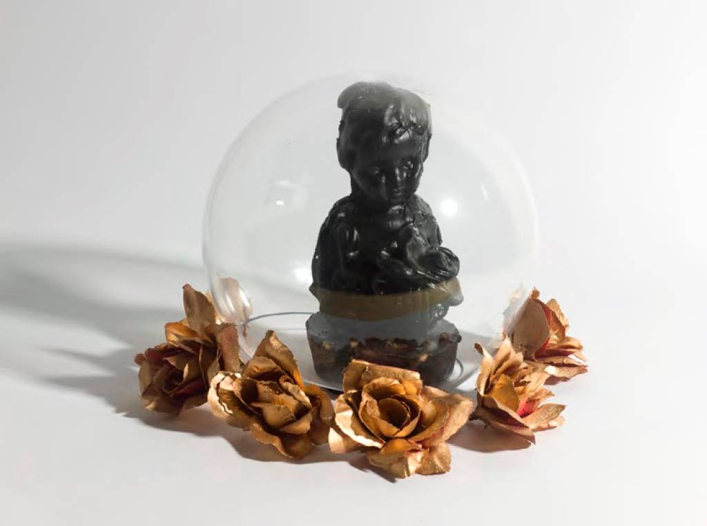 ״ראש בובה מצופה עלי זהב מתנוסס בגאון על כותרת צמחית בסגנון קלאסי לצד פרוטמות מפוסלות או מצויירות, של אלות (בנות אלמוות), שהוכנו בטכניקות מעורבות על גבי צלולואיד או נייר והודבקו על קופסאות עץ כאיקונין. פסלון מלאכית עם כנפיים מוזהבות תלויי על קיר כפרפר חנוט; נוצה לבנה ושחורה נאטמו במסגרת זהב בעלת דפנות זכוכית; מחרוזת פנינים משולבת בנוצות שחורות וזרי פרחים מבד שחור – כל אלה יוצרים מעין דחיסות מחניקה מהולה בקדושה״.