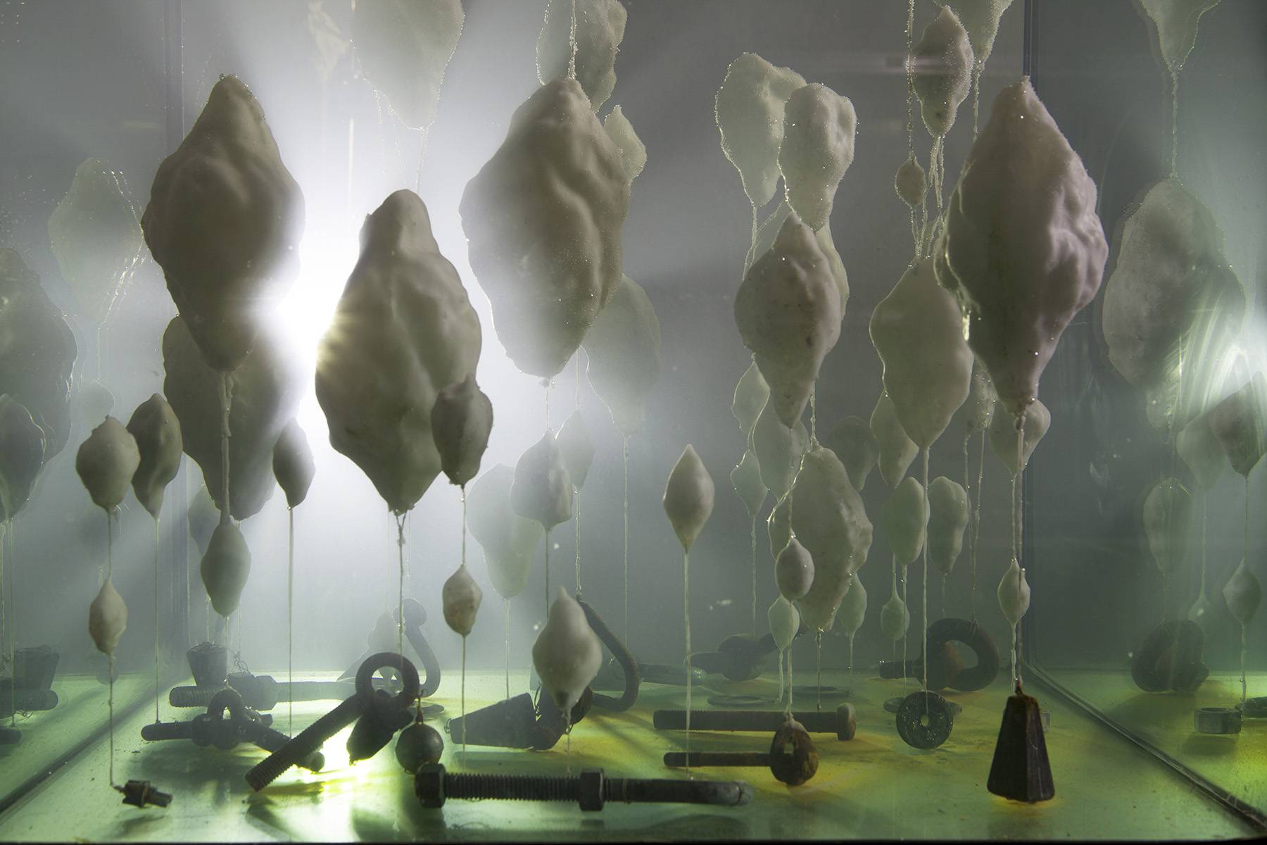 זה מיקס של חומרים בשכבות: יש בפנים קלקר, סיליקונים, שעווה ועוד חומרים שאת שמם אני לא זוכר. אני מפסל אוביקטים מחימר, מתבנת אותם בגבס ומייצר אותם שוב מחומרים שיאפשרו לי לשים אותם בנוזל לזמן ממושך תוך כדי שהם יצופו וימשיכו לצוף. אני מאוד נהנה לעבוד ככה, זה תהליך ארוך עד שנולד סוג של מדיום חומרי לעבודה, ניסוי ועוד ניסוי בסטודיו, ואז איזו טעות אחת שעובדת ושבועות של נסיונות להבין מה קרה בטעות שעבד ולשחזר את זה שוב עד שנולדת טכניקה חדשה ליצירה.