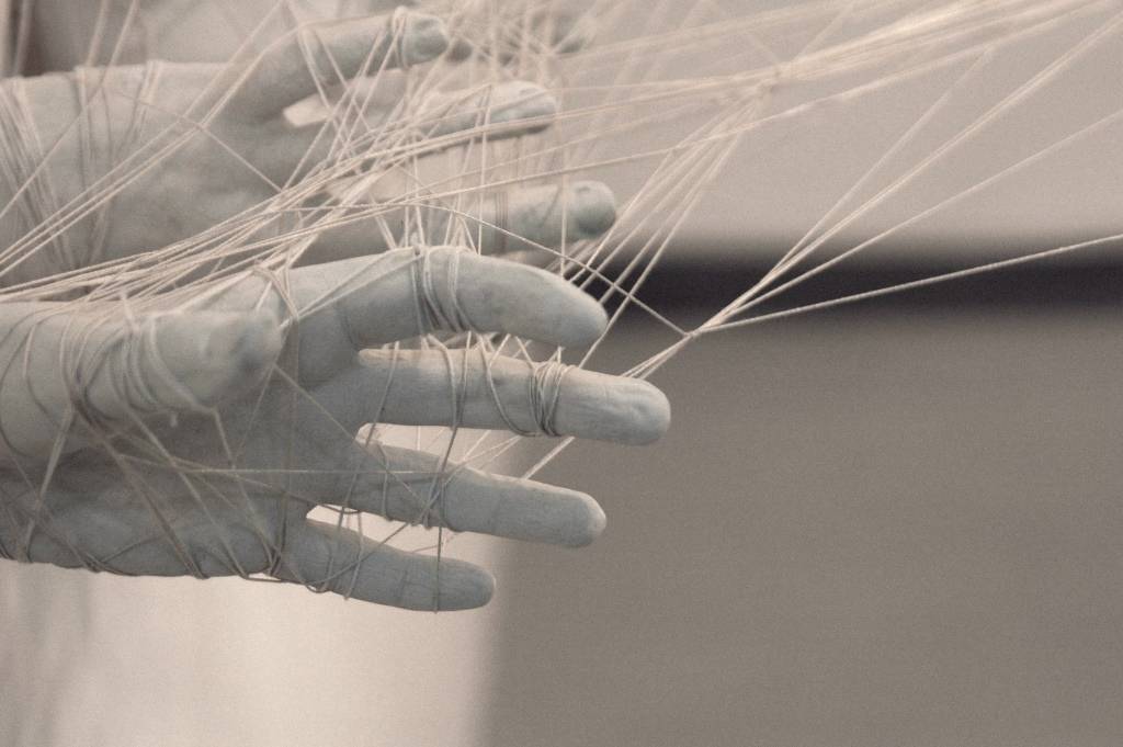 זה כמו תמונות המסמרים שהיינו עושים כשהיינו ילדים. אני עובדת מאצבע אחת ועוברת לולאה לולאה בין האצבעות שממולה, ויש איזו שיטה, משהו מאוד קבוע שאין לי דרך להגדיר אותו חוץ מאובססיבית. התוצאה היא שמצד אחד היא נראית קשורה וכלואה ומצד שני הכול תלוי במתח בין האצבעות הפשוטות – אם יד אחת תרפה את האחיזה כל המבנה יקרוס. זה נראה כמלכודת אבל יש פה איזון מאוד עדין״.