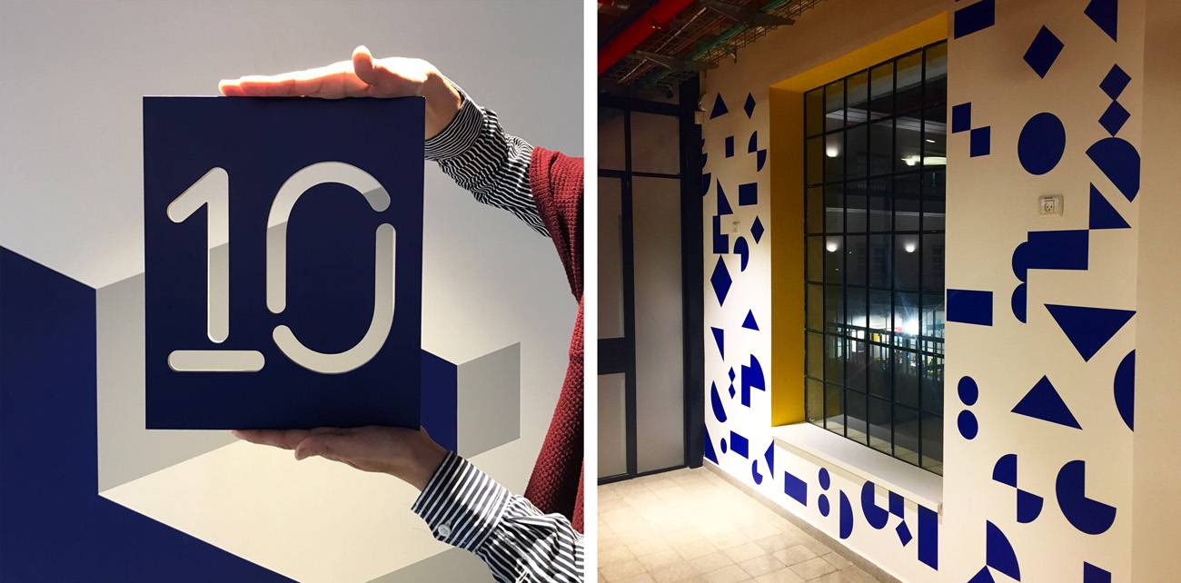 צורה וצבע: איך מחדשים בשימוש גרפי של צורות יסוד וכיצד מייצרים חווית שיטוט מעניינת ומגוונת? החיבור בין העירוני לבין סגנון ״בין־לאומי״; יצירת רצף המספר סיפור דרך הליכה לאורך המסדרונות; בנייה של פאטרנים גאומטריים, כאשר לצורה אחת יש כמה מופעים שונים. כמובן חשוב לא פחות, בחירה נכונה, נבונה ומוצדקת של פלטת צבעים וגופן. בפרויקט הזה נעשתה בחירה בגופן ״הצבי סטנסילז״ כחלק מאזכור היסטורי נוסטלגי לתל אביב של פעם, לעומת צבעים עזים וחזקים: כחול רפלקס, צהוב ושני גווני אפור משלימים.