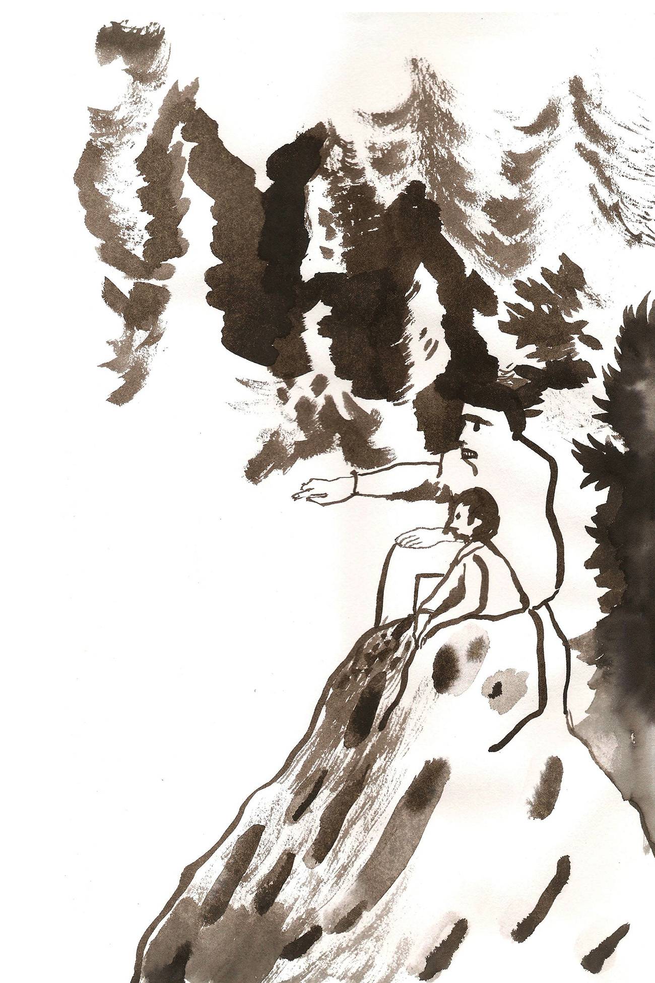 נכון. השחור־לבן הולם מאוד את טכניקת התחריט לטעמי, וגם את הסיפור. כניסת הצבע היחידה הייתה בכלל סקיצת טושים שעשיתי ולא חשבתי להכניס. ככלל איורים רבים לא נכנסו, אבל את הסקיצה הזאת מאוד אהבתי. היה בה משהו פרוע יותר שנתן זריקת צבע וחיים. אני אוהבת את זה שאין אחידות סגנונית, למרות שזה נוגד את מה שלרוב מלמדים ☺
