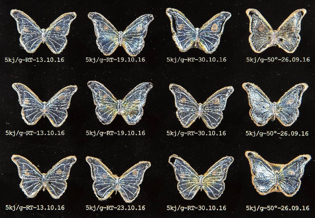 כן, בהחלט. אחת העבודות שלוקחות את העיסוק בנייר לאיזשהו אקסטרים היא עבודתן של שירה שובל ואריאל בלונדר, שלקחו את המרכיב הבסיסי שקיים בכל נייר – הצלולוז (התאית) – והפיקו אותו בתהליכי מעבדה ננו־טכנולוגיים בשיתוף עם הפקולטה לחקלאות ברחובות. הם פירקו פסולת נייר לחלקיקי הננו של הצלולוז לכדי נוזל שקוף, ויצקו ממנו פרפרים המשנים את צבעם על פי שבירת קרני האור עליהם, שהוצגו כאוסף פרפרים נדיר או כתכשיטים יקרי ערך.