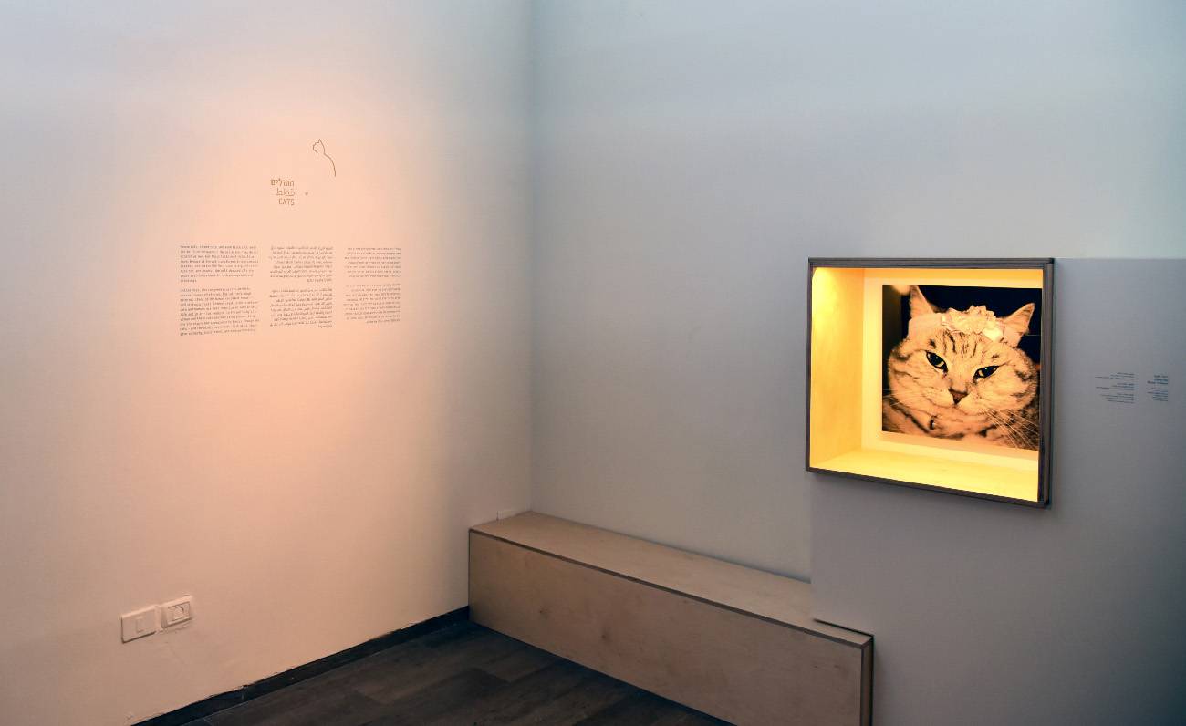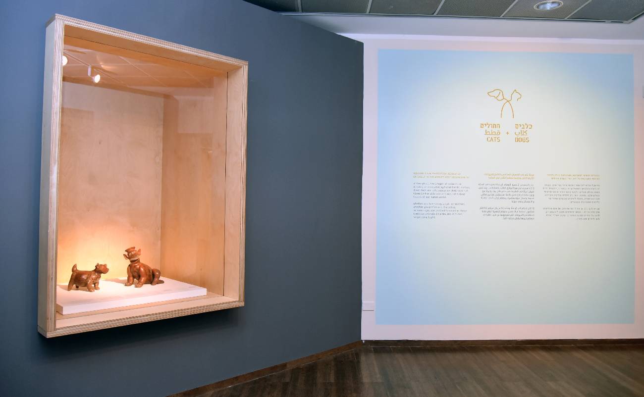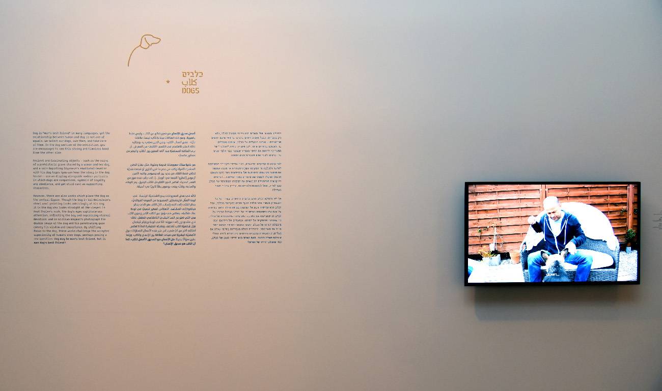 מתוך התערוכה כלבים וחתולים. האיורים של איתן אלוא (מימין) לצד לוגו התערוכה. צילומים: בני מאור
