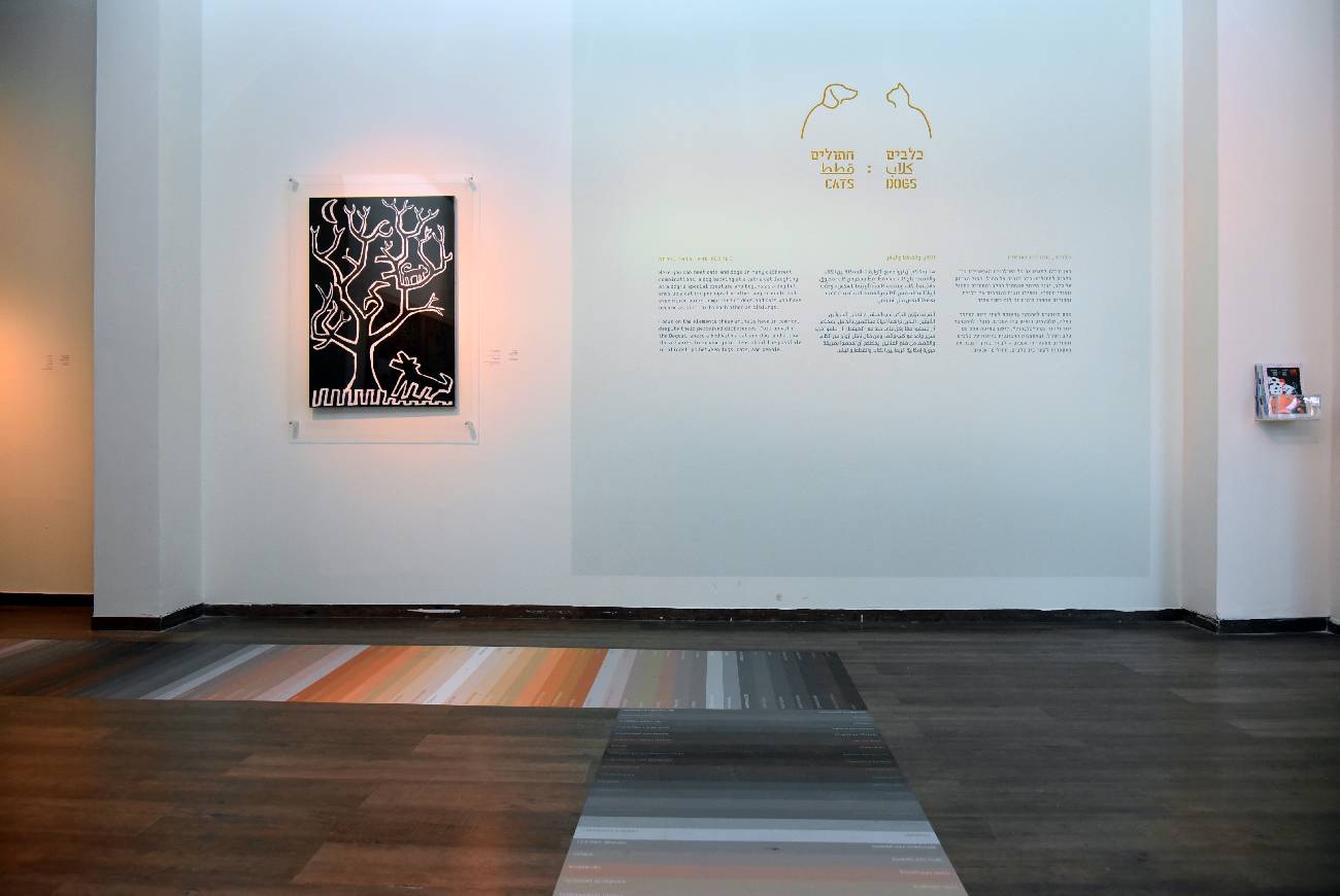 מטרת השטיח הגרפי שמקיף את התערוכה, היא ליצור רצף צבעני שמבהיר באופן שלא ניתן לערעור שחתול = כלב (!) מכיון שהם חולקים את אותה פלטה צבעונית. לכן השטיח כלל מלבני צבע, בדומה למניפת צבעים, שהגדירה את זני הכלבים לעומת זני החתולים והובילה את הצופה בחללי התצוגה השונים.