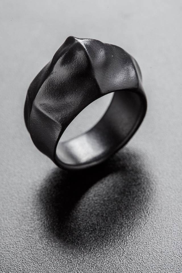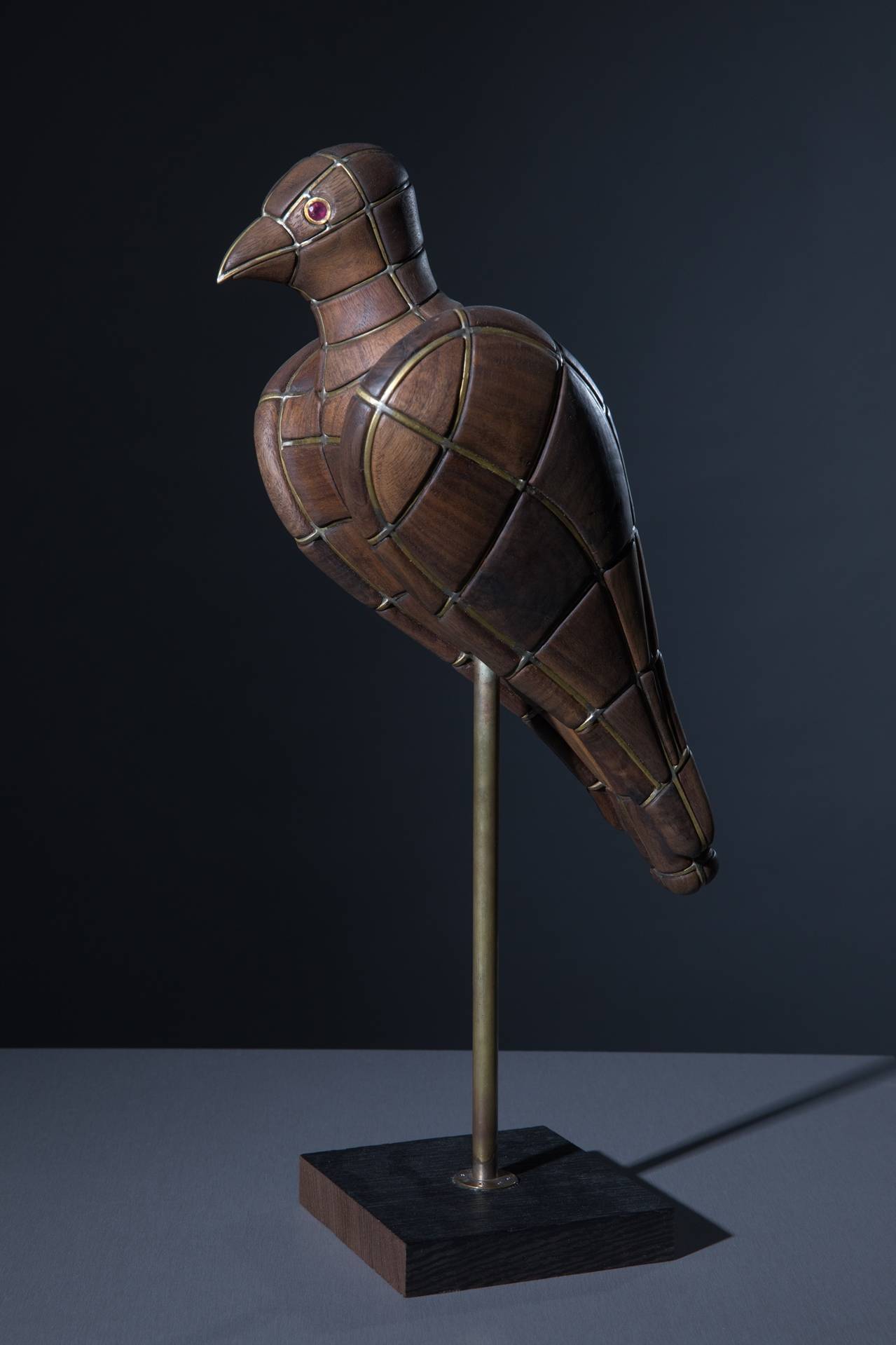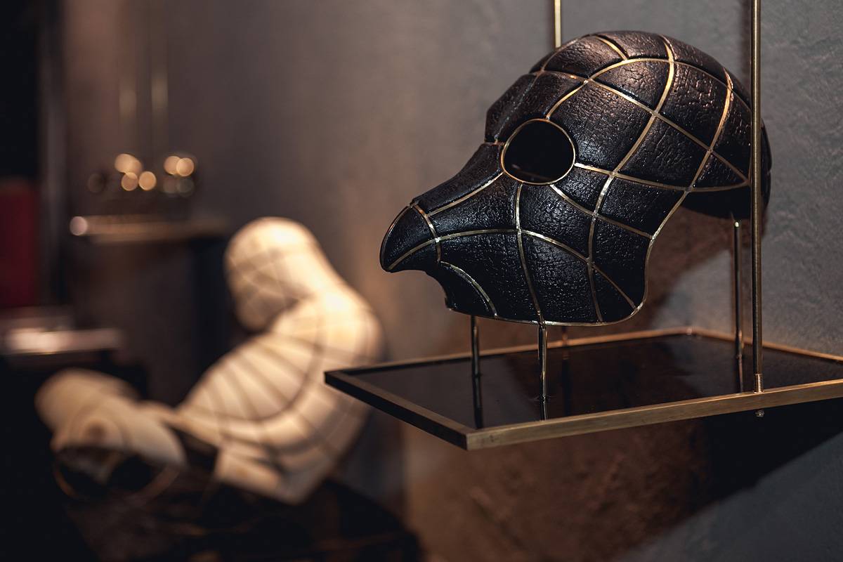 הפסלים והתכשיטים מוצבים על מערכת מדפים מרחפים, מינימליסטיים, שגם הם מעשה ידיו. חלקם תלויים באוויר, חלקם על רגלים דקות, הם ממסגרים את הפריטים ומבודדים אותם למבט. התוצאה היא שורת פסלים דרמטית על רקע הקיר האפור כהה, ובסופה תבנית נירוסטה קרה, שטבעות מוטלות בתוכה כמו אברי גוף אחרי עקירתם, בתהליך השימור של המומיה.