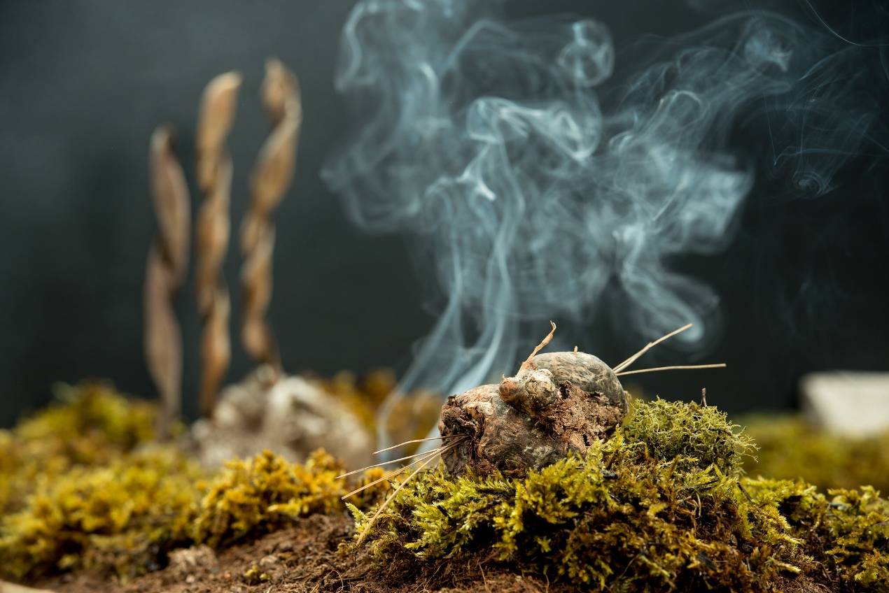 שני בן אליהו יצאה מגבולות החלל ועבודתה מתחילה בחוץ בערימת קליפות עת שהיא מפסלת כמגדל תפילות או טוטם קטן בטבע. בפנים היא מציבה מבוך תיבות מוגבהות, שבתוכן יצרה אקו־סיסטם של טחב, אדמה וצמחייה. הצופה מתבונן בהם בהצצה כשראשו בגובה הנוף. ״השינוי, ההתכלות וקבלתם של תהליכים אלה הם נושאים המעסיקים אותי ביצירה. כיצד לקבל את היותנו חלק בלתי נפרד מהטבע וממחזוריותו, מהשינוי המתמיד שבהוויה, מהיותנו בני חלוף״.