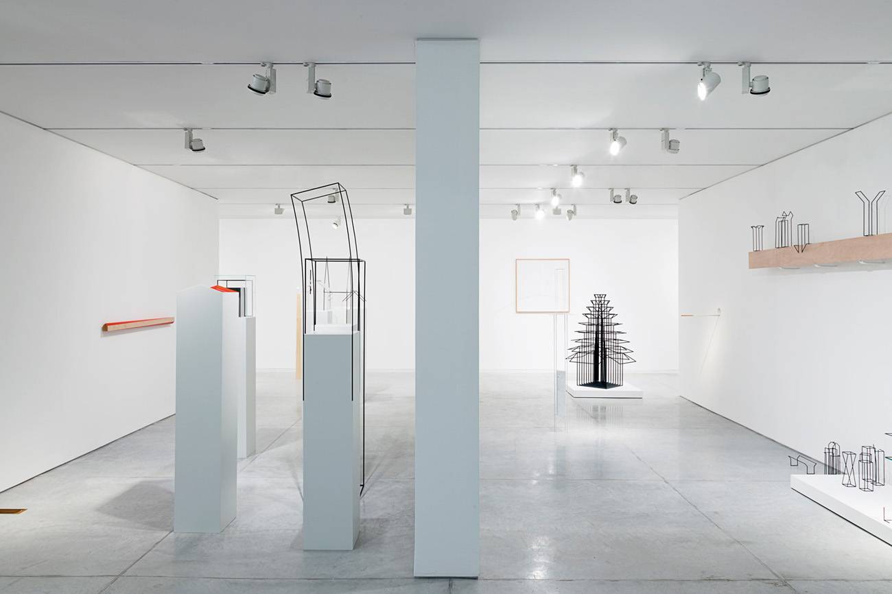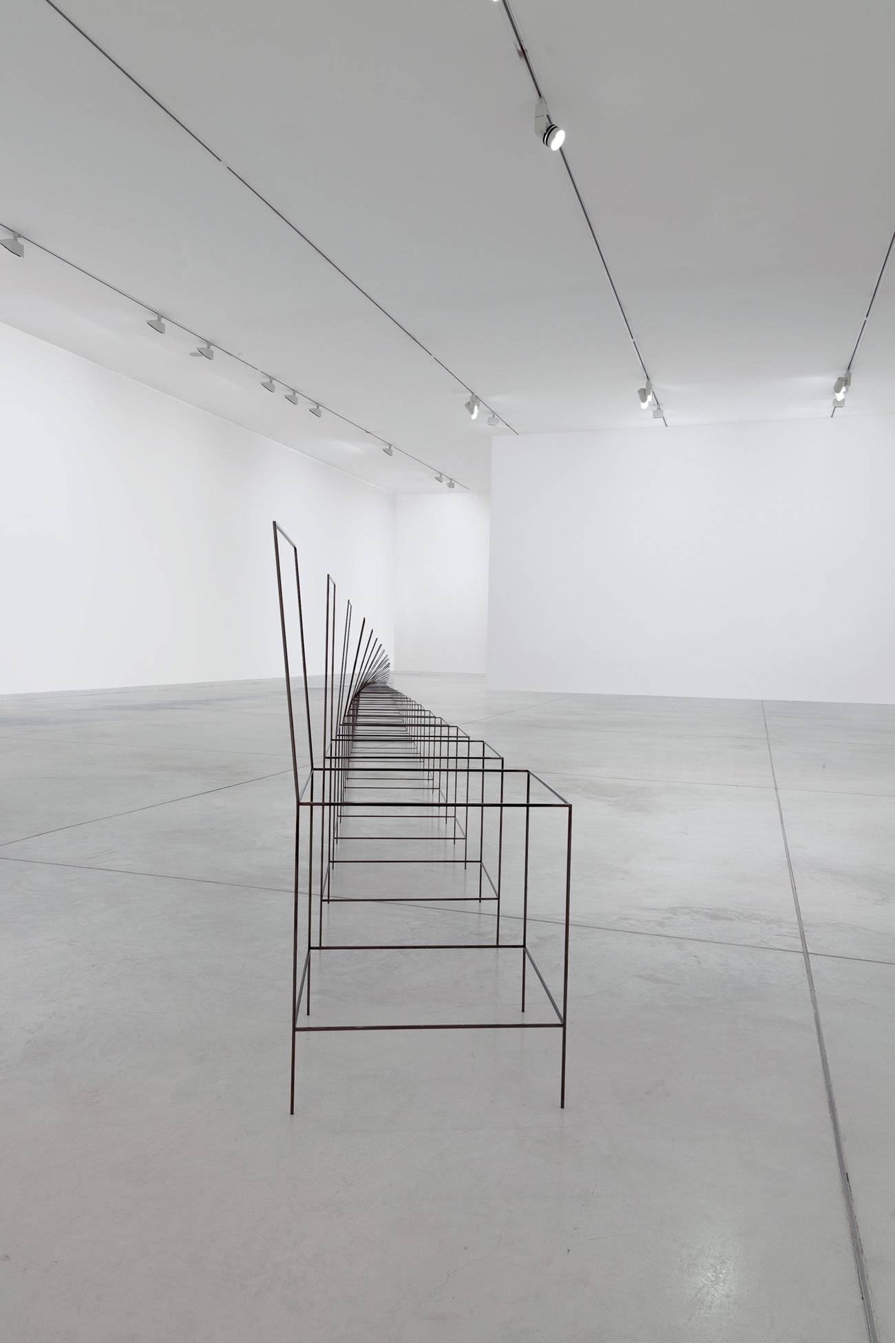 פס דק אפור של עיפרון על הקיר ממשיך פס תאורה שקועה, ובסופו של הקו, מה שמרחוק נראה כנקודה לא ברורה, מתגלה כאיש זעיר שרוכב על אופניים בגודל סנטימטר או שניים לכל היותר. על קיר אחר הונחו 16 מהדקי נייר שחוברו זה לזה בצורת עיגול ואליהם חוברו מהתקרה 16 חוטי דיג שקופים. הדרך היחידה להבחין בקיומם היא הצל העדין שהם יוצרים על הקיר והלכה השחורה המינימליסטית שיוצרת עליהם מבנה מעגלי שברירי באוויר.