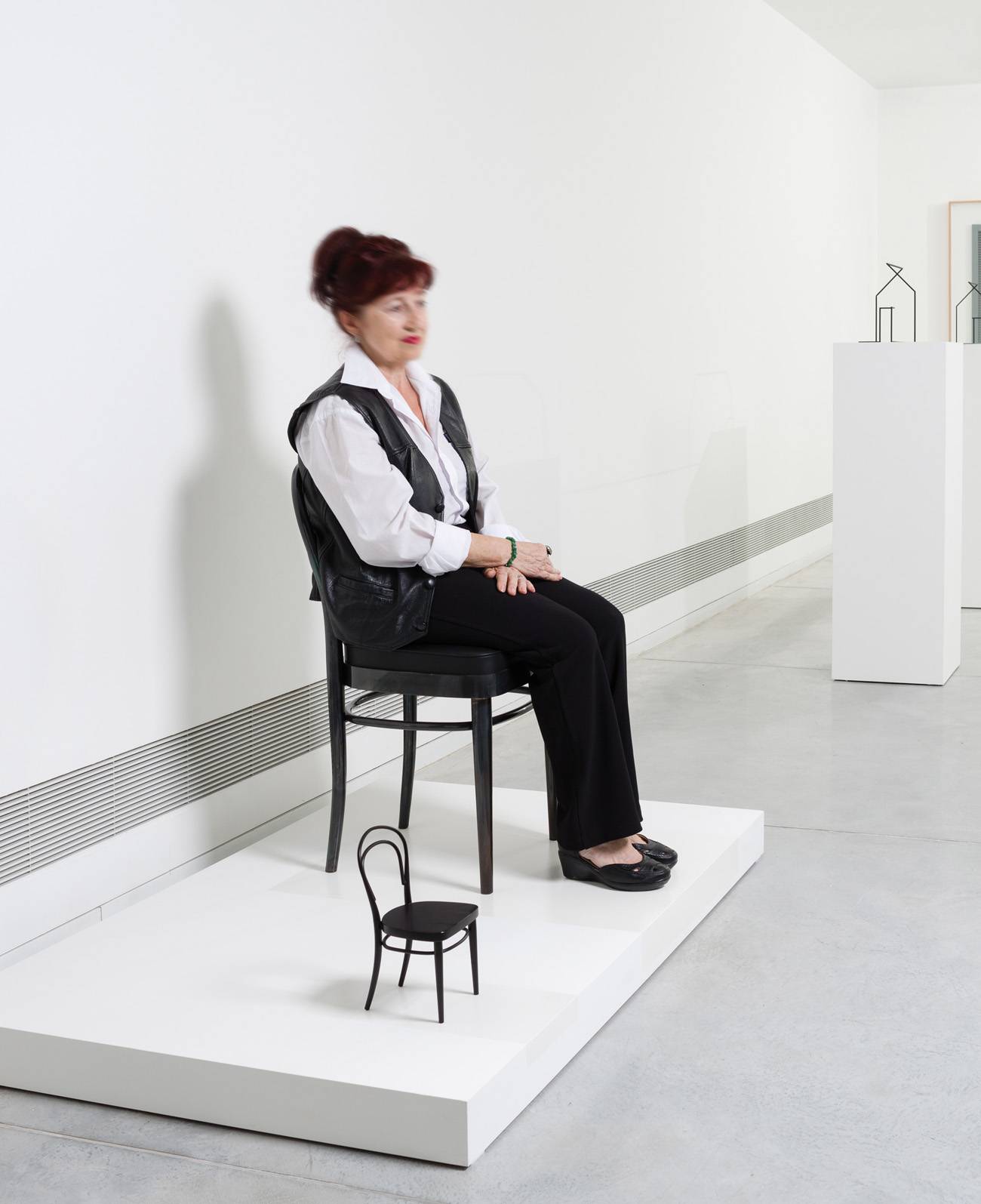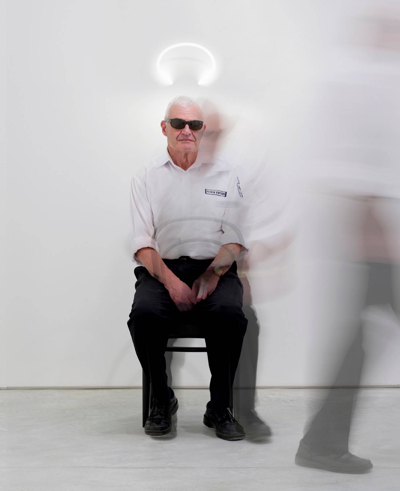 בכניסה לתערוכת היחיד של רון גלעד, שנפתחה בחודש שעבר במוזיאון תל אביב, יושבת שומרת על כיסא. אין בכך כמובן שום דבר מפתיע, מלבד העובדה שהשומרת יושבת על אחת העבודות שמוצגות בתערוכה, ״כיסא מס. 1״ שמה, והיא כוללת כיסא שחור שנמצא על במה לבנה מוגבהת ולצדו העתק מיניאטורי שלו. בקצה השני של הגלריה יושב שומר אחר על כיסא, גם הוא חלק מהתערוכה. העבודה, ״שומר מס. 2״, כוללת מלבד הכיסא גוף תאורה בצורת קשת שמפיץ אור לבן והותקן מעל ראשו של השומר. כתוצאה מכך נראה כאילו יש לשומר הילה מעל הראש.