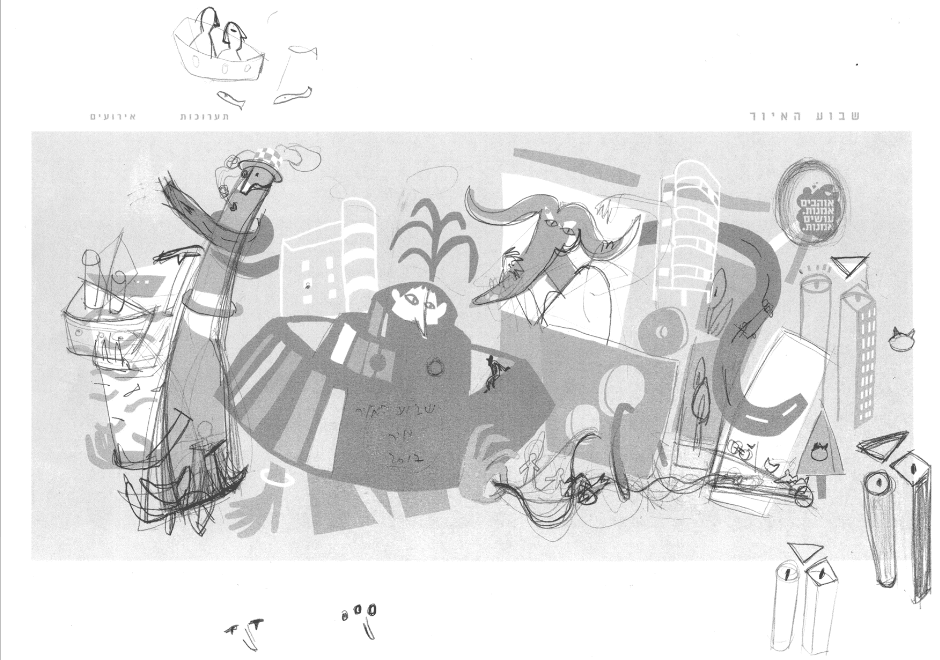 התחלתי עם סקיצות למספר פסלים ומבנים אהובים וזכורים בעיר והוספתי להם עיניים וידיים, אהבתי שזה לקח כל מבנה למקום מפתיע ואחר. את הדמויות חיברתי יחד לטובת האיור הראשי שמופיע באתר שבוע האיור, משם יצאתי והפרדתי את הדמויות לפורמטים השונים. הניסיונות הראשונים של הביצוע היו דווקא בסגנון וקטורי שהיה פחות מוצלח לטעמי, הרגשתי שהוא קר ומאט את התנופה שאני רוצה להעביר עם הדמויות.