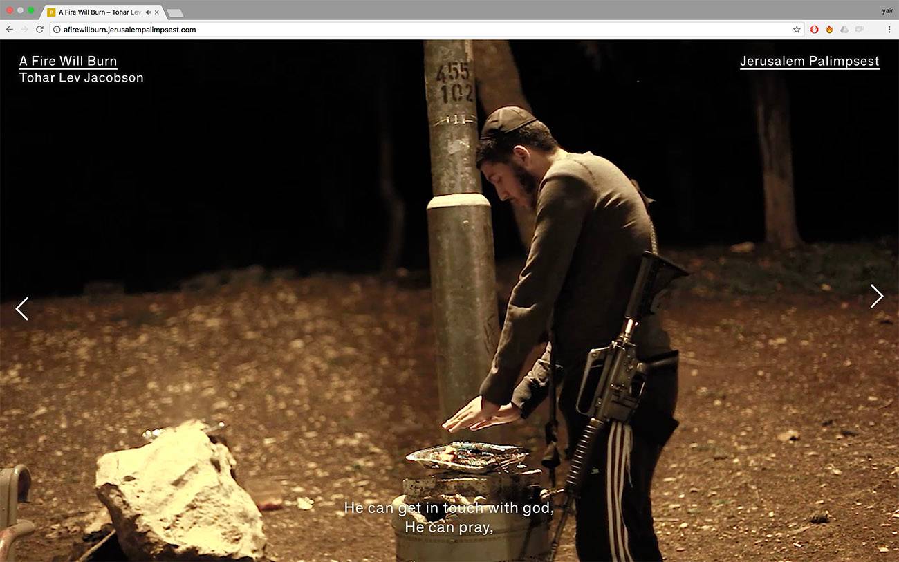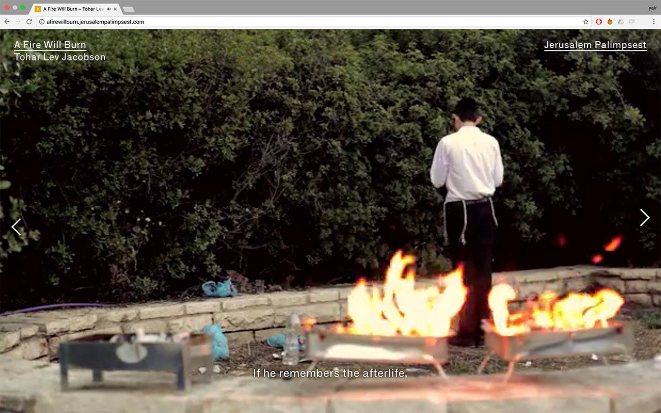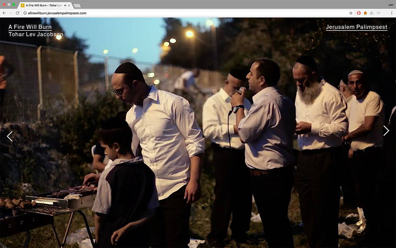 בעבודה ״אש תוקד״, טוהר לב יעקובסון תיעד במשך שנה את המרחב הציבורי של גן סאקר ואת המנהגים שהציבור החרדי/דתי עושה שם בזמנו הפנוי. בסופו של הפרויקט הוא יצר סרט קצר בן 20 דקות שמורכב מסצנות שונות שהוא צילם, וביחד איתו ניסינו לפצח איך לוקחים פרויקט שהוא בבסיסו התבוננות במרחב פיזי ומייצרים לו פלטפורמה דיגיטלית. היו המון גלגולים ומחשבות, כמו גם הצורך לפרק את התוצר המקורי ולבנות אותו מחדש, שיותאם לחוויה דיגיטלית, מה שלווה כמובן גם בחששות מצד האמן. בסופו של דבר יצרנו דרך חדשה לספר סיפור על מקום ומרחב, דרך שבה הצופה בוחר לאן הוא בוחר לשוטט בתוכה, על מה הוא מתעכב ועל מה הוא קופץ הלאה